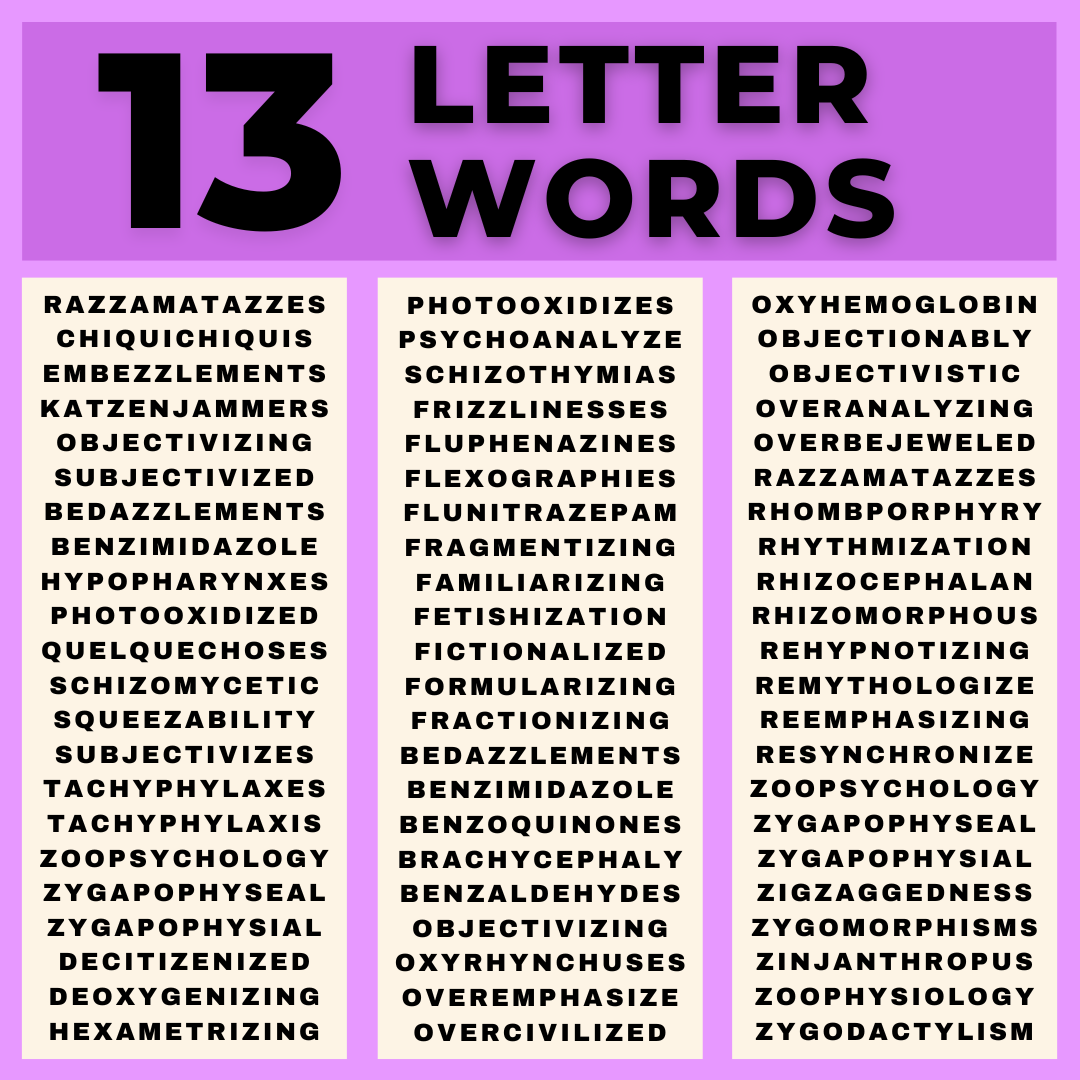 A list of 13-letter words can be found in comprehensive English dictionaries which would be quite difficult to find out a specific word manually. However, using our tool you can easily find out the exact 13-letter word you need by using our advanced filters.