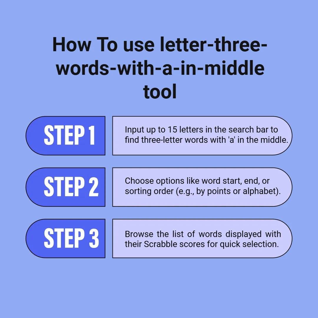 You can easily choose the appropriate word from the extensive list provided by the Three Letter Words with ‘A’ in the Middle tool using the advanced filters and sorting options. You can specify the starting and ending letters, as well as the word lengths, to refine your search. Additionally, you can organize the list either alphabetically or by reverse alphabetical order or based on each word’s scoring points.