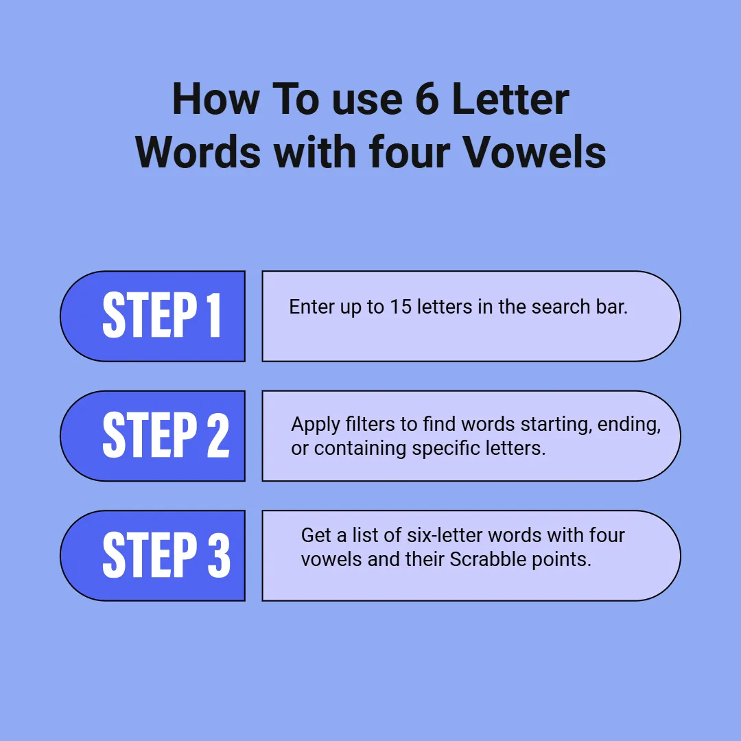 Our online word collection tool that displays six Letter Words Containing four Vowels will allow you to customize your search results according to your specific requirements, such as words that contain, start, and ends with specific letters. Furthermore, our tool can arrange the results either in alphabetical order or reverse alphabetical order, or according to the highest score points. The six Letter Words Containing four Vowels tool will also display the score for each word which will help you to choose the right word to level up your game. Learn the meaning of each word with the help of our available dictionaries. Henceforth, using our tool will not struggle you to find the words that you want to express.